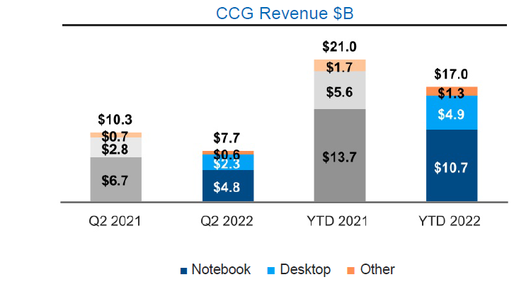Estatísticas mais detalhadas podem ser estudadas no formulário de relatório 10-Q que apareceu nas páginas do site da Intel. No segmento de clientes, a receita da empresa no segundo trimestre, lembramos, diminuiu de US$ 10,3 para US$ 7,7 bilhões, e deste último valor, US$ 4,8 bilhões vieram de componentes para laptops e US$ 2,3 bilhões de componentes para sistemas de desktop. A receita no segmento de notebooks diminuiu 29%, no segmento de desktops – 18%. Em ambos os casos, a dinâmica das entregas dos componentes correspondentes em termos unitários deteriorou-se a um ritmo mais acelerado.