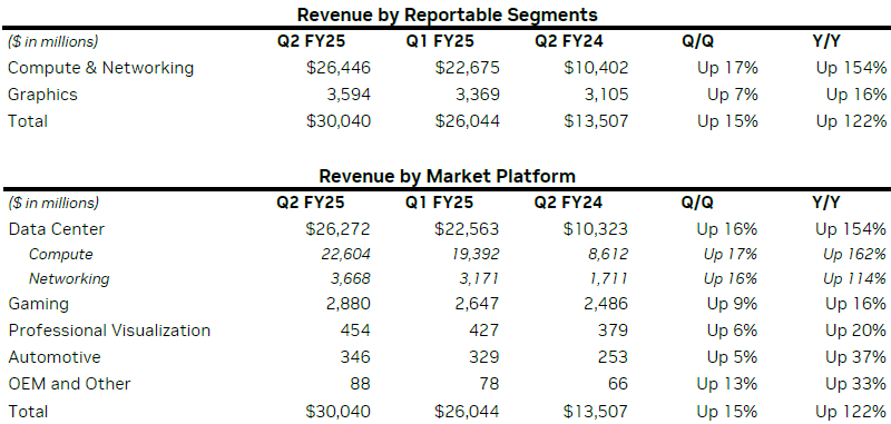 No segmento de data centers, que representou 87,6% da receita total da empresa no último trimestre, a Nvidia recebeu US$ 26,3 bilhões. Sua receita nesta área aumentou 154% ano após ano, superando as expectativas dos analistas. Porém, mesmo no segmento de servidores, a receita da Nvidia não foi uniforme. Desse valor, aproximadamente US$ 3,7 bilhões vieram de receitas com a venda de soluções de telecomunicações, o que representa 114% a mais que os resultados do mesmo período do ano passado. Os provedores de serviços em nuvem foram responsáveis por 45% da receita de servidores da Nvidia no segundo trimestre. Componentes de computação diretamente para uso em servidores adicionaram 162%, para US$ 22,6 bilhões em receita.