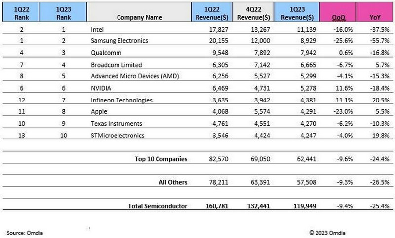 Uma forte queda no mercado de memória por vários trimestres levou a uma redução nas participações dos fabricantes de memória no mercado de semicondutores. Há um ano, três das cinco maiores empresas de semicondutores em receita eram empresas de memória: Samsung, SK hynix e Micron. Destes, apenas a Samsung conseguiu ficar entre os dez primeiros. E a SK hynix e a Micron não saem do top 10 desde 2008, o que ilustra claramente os desafios enfrentados pelas empresas de memória.