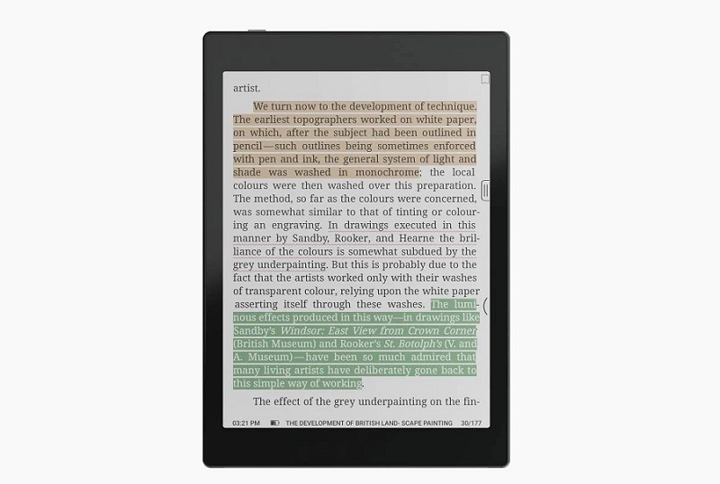 O novo tablet tem uma pequena tela de 7,8 polegadas e é um pouco semelhante a um Kindle típico, do tamanho de um iPad Mini. O modelo pesa 264 g e tem 8,3 mm de espessura. A tela não apenas usa a tecnologia Onyx Kaleido 3 Color ePaper, mas também possui um revestimento de vidro e suporta o uso de uma caneta (vem com 4096 níveis de sensibilidade à pressão). A densidade de pixels da tela é de 300 PPI, a resolução é de 1404 × 1872 pixels ao usar a tela no modo monocromático. No modo colorido, a densidade cai para 150 PPI e a resolução para 702×936 pixels.