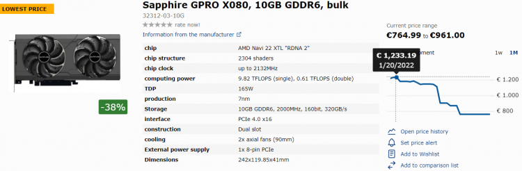 De acordo com o site de comparação de preços Geizhals, o preço da Sapphire GPRO Radeon X080 despencou nos últimos tempos. Se no dia 20 de janeiro uma placa de vídeo custava mais de 1200 euros, agora ela pode ser comprada por 764,9 euros. O cartão caiu de preço em 38% em menos de um mês.