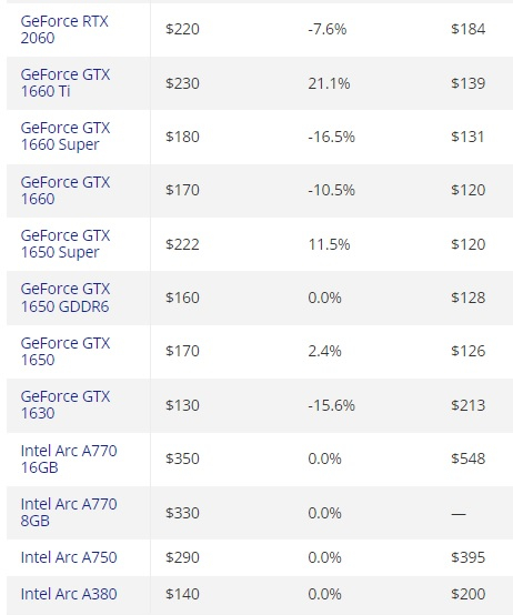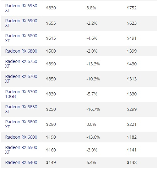 Para comparação, no caso das GPUs AMD, os preços estão caindo em quase todos os modelos modernos, com a possível exceção da Radeon RX 6950, que subiu de preço em 4%. Radeon RX 6750/6700 XT, RX 6650 XT e 6600 caíram 10% ou mais no preço.