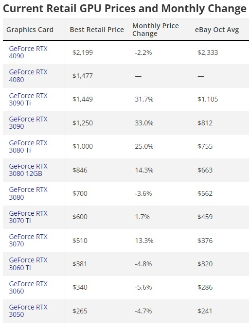 Em comparação com o mês anterior, a NVIDIA GeForce RTX 3090 Ti e 3090 aumentaram mais de 30% no preço, a 3080 Ti aumentou 25% e a 3080 com 12 GB de memória custa cerca de 15% a mais do que antes. Isso também se aplica a outros cartões da série. Porém, a partir da GeForce RTX 3060 Ti e abaixo, as placas começaram a cair de preço.