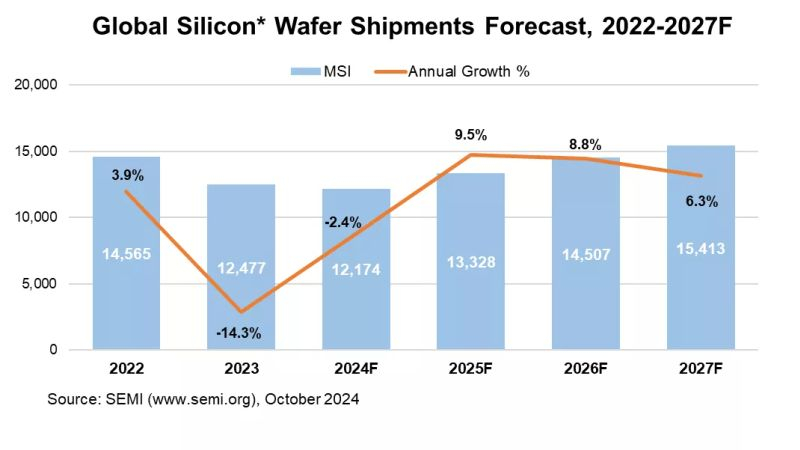 A fonte espera que não mais do que 12,174 bilhões de polegadas quadradas de pastilhas de silício sejam enviadas em todo o mundo este ano, mas no próximo ano esse número aumentará 9,5%, para 13,328 bilhões de polegadas quadradas. O crescimento nos volumes de fornecimento de wafers de silício será observado até 2027 inclusive, embora desacelere gradualmente: para 8,8% em 2026 e 6,3% em 2027.