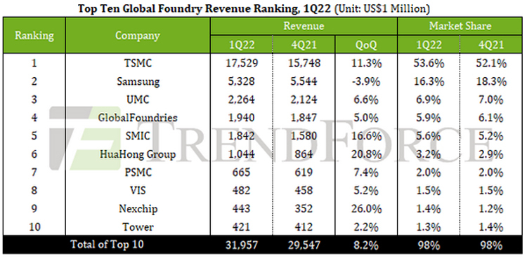 A TSMC continua sendo a líder de mercado global com US$ 17,53 bilhões em receita trimestral, um aumento de 11,3% em relação ao último trimestre de 2021. A participação da empresa taiwanesa atingiu 53,6% nas vendas totais.