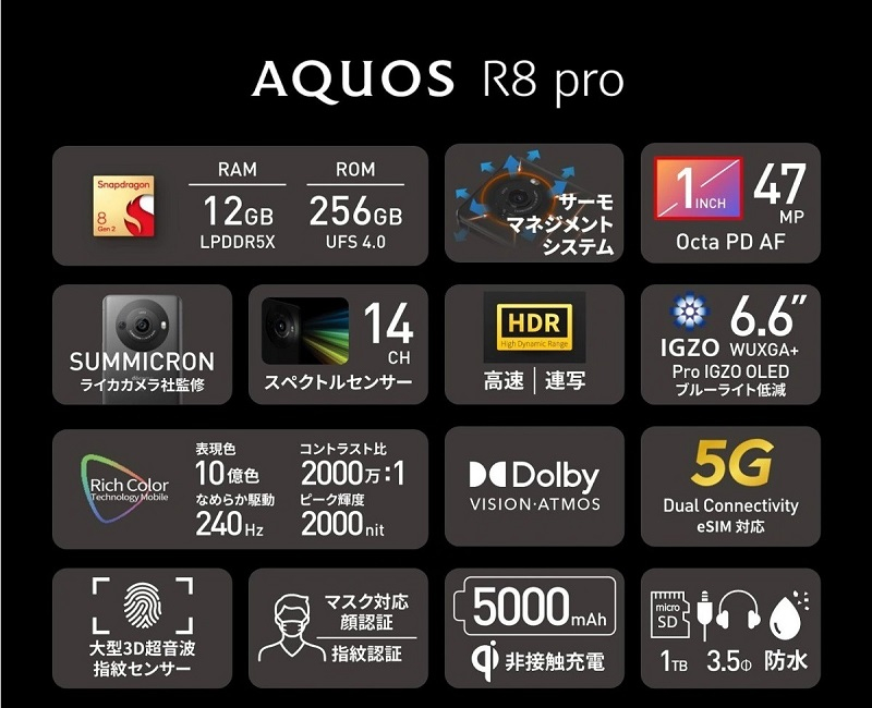 O Aquos R8 Pro possui uma tela IGZO OLED de 6,6 polegadas com taxa de atualização de 120 Hz, resolução de 1260 × 2730 pixels e brilho máximo de 2000 cd/m2. A capacidade da bateria é de 5000 mAh, são 12 GB de RAM e 256 GB de memória permanente. O scanner de impressão digital Qualcomm 3D Sonic Max integrado na tela é usado.