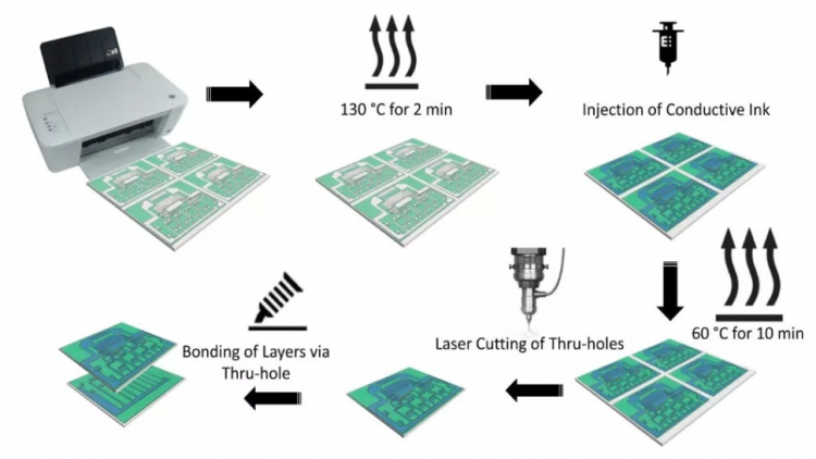 O processo envolve a impressão de um modelo de cera em papel seguido de tratamento térmico, aplicação de tinta especial para criar trilhas condutoras, além de impressão de assentos para elementos funcionais e furos de corte a laser, além da combinação de camadas através de furos. Espera-se que tais placas sejam tão flexíveis quanto o papel convencional.