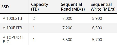 O novo SSD AI TOP UD de 1 TB difere dos modelos da série 100E por uma velocidade de leitura sequencial até 700 MB/s menor e uma velocidade de gravação sequencial até 800 MB/s menor. Além disso, a vida operacional do AI TOP UD SSD 1 TB é metade da do modelo SSD 100E 2 TB (219.000 TBW), mas corresponde ao recurso do modelo SSD 100E de 1 TB.