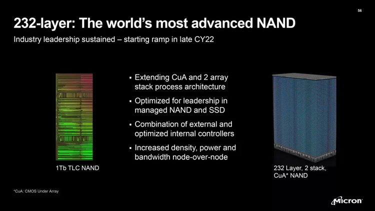 A empresa americana Micron apresentou os primeiros chips de memória flash 3D NAND da indústria, compostos por 232 camadas. A produção em massa de novos itens baseados em células TLC começará no final de 2022. O aparecimento dos primeiros produtos na nova memória está previsto para 2023. O aumento da densidade de armazenamento promete menor consumo de energia, velocidades mais rápidas e custos mais baixos, o que se traduzirá em lucros da Micron ou preços mais baixos de SSD.