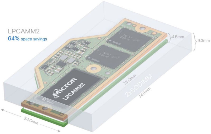 A Micron lançará a produção em massa de módulos LPCAMM2 no primeiro semestre de 2024 – este é um novo formato revolucionário desde o lançamento do padrão SODIMM em 1997. LPCAMM2 é baseado em chips LPDDR5X, mas comparado ao formato tradicional, oferece uma redução de 61% no consumo de energia e um aumento de 71% no desempenho para cargas de trabalho principais do PCMark 10, como navegação na web e videoconferência. A economia de espaço em relação ao SO-DIMM é de 64%.