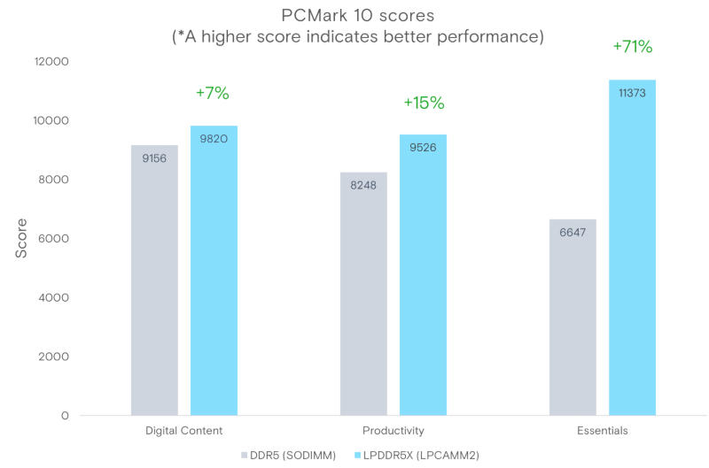 Os módulos de memória LPCAMM2 em chips LPDDR5X atingem velocidades de 9.600 Mbit/s, enquanto as tiras SO-DIMM DDR5 existentes demonstram 5.600 Mbit/s. No modo standby, a economia de energia chega a 80%, o que ajuda a aumentar a vida útil da bateria dos computadores móveis; nas tarefas relacionadas à produção de conteúdo digital, o aumento de produtividade é de 7%.