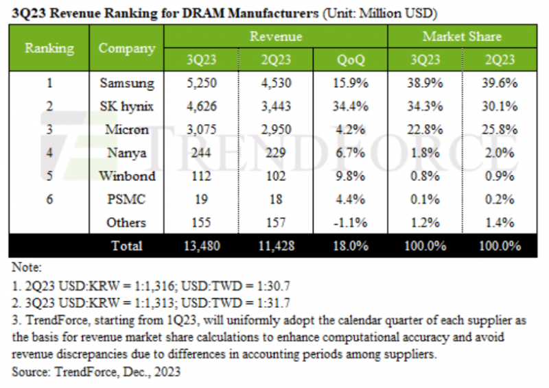De acordo com a pesquisa TrendForce, o mercado DRAM experimentou uma recuperação significativa no terceiro trimestre de 2023, com a receita total subindo para US$ 13,48 bilhões. Isto corresponde a um aumento de 18 por cento em comparação com o trimestre anterior.