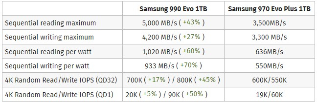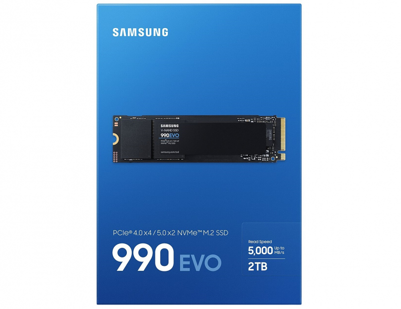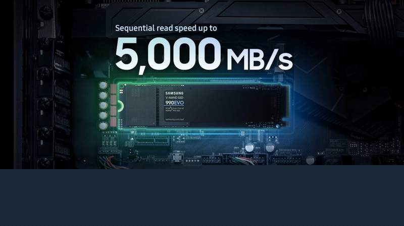 Como você sabe, a série de unidades Samsung 990 Pro é o carro-chefe do fabricante. Esses SSDs oferecem velocidades de leitura e gravação sequenciais de até 7.400 e 6.900 MB/s. No entanto, essas unidades suportam apenas a interface PCIe 4.0. Por sua vez, o modelo 990 Evo tem maior probabilidade de ser uma solução de classe média. A unidade oferece velocidades de leitura e gravação sequenciais de até 5.000 e 4.200 MB/s. No entanto, o recurso exclusivo do 990 Evo é o suporte para quatro pistas PCIe 4.0 e duas pistas PCIe 5.0. A largura de banda de duas pistas PCIe 5.0 equivale a quatro pistas PCIe 4.0.