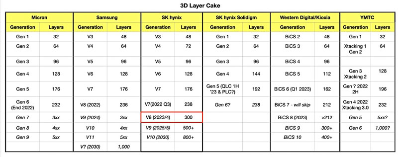 Apresentado pela SK hynix, um protótipo de chip de memória NAND com mais de 300 camadas consistia em células de três bits (TLC) e ostentava uma capacidade de 1 Tbit. Devido ao aumento do número de camadas, a densidade da célula aumentou de 11,55 Gb/mm2 para a atual memória de 238 camadas para mais de 20 Gb/mm2. O desempenho geral da memória foi aumentado de cinco maneiras distintas, geralmente destinadas a acelerar os processos de gravação, exclusão e leitura. Para fazer isso, tivemos que fazer alterações nas sequências e tempos dos comandos.