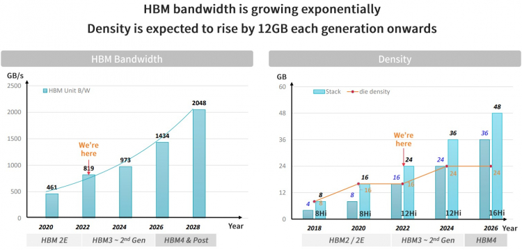 Nota-se também que o HBM3 tem sérias perspectivas de aumentar a densidade. Este tipo de pilha de memória pode incluir até 12 chips. Agora, isso permite que você coloque até 24 GB de memória em uma pilha, mas em dois anos a SK hynix pretende criar pilhas de 36 GB. A longo prazo, são possíveis pilhas HBM3 de 16 camadas com capacidade de até 48 GB. Mas, ao mesmo tempo, a memória HBM4 também aparecerá.