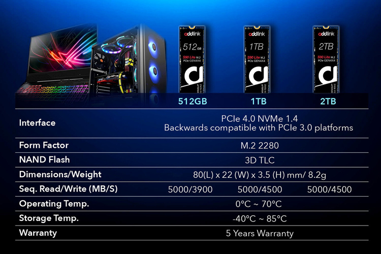 A série Addlink S90 Lite inclui três modelos – 512 GB, além de 1 e 2 TB. A velocidade de leitura sequencial de todos os dispositivos chega a 5000 MB/s. A velocidade de gravação sequencial é de 3900 MB/s para a versão mais nova e 4500 MB/s para as outras duas.