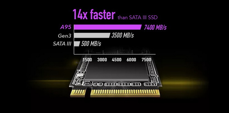 As unidades Addlink AddGame A95 são baseadas em um controlador de memória Phison PS5016-E16-32 com suporte ao protocolo NVMe 1.4 e barramento PCIe 4.0, bem como chips de memória flash 3D NAND TLC. O fabricante afirma velocidades de leitura sequencial de até 7400 MB / s para novos produtos e velocidades de gravação sequencial de até 7000 MB / s, que são duas vezes mais rápidas do que as unidades PCIe 3.0 e 14 vezes mais rápidas do que os SSDs SATA.