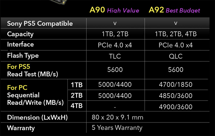 Os produtos AddGame A92 são baseados em microchips de memória flash QLC NAND: a tecnologia permite o armazenamento de quatro bits de informação em uma célula. A série inclui modificações com capacidade de 1, 2 e 4 TB. Quando usado com o PlayStation 5, a velocidade de leitura de informações chega a 5600 MB / s, quando instalado em computadores pessoais – 4900 MB / s. A velocidade de gravação de dados é de até 3600 MB / s.