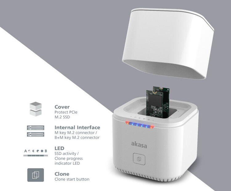 No painel frontal da novidade está o botão Clone, que permite criar unidades de estado sólido M.2 duplicadas sem a necessidade de conectar a um computador. Além disso, a indicação de status do LED é fornecida.