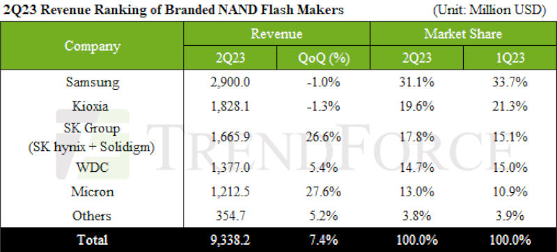 O mercado de memória flash NAND não conseguiu superar a fraca demanda no segundo trimestre, que continua atrás da oferta. No entanto, os volumes de remessas aumentaram 19,9% em comparação com os três meses anteriores, e a receita dos fabricantes aumentou 7,4% sequencialmente, para US$ 9,338 bilhões, calcularam os analistas da TrendForce.