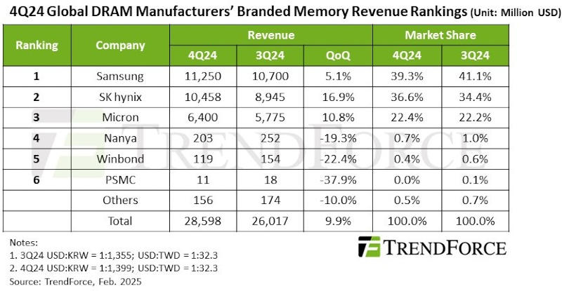 A Samsung continuou sendo a principal fornecedora de DRAM, com receita de US$ 11,25 bilhões, um aumento de 5,1% em relação ao trimestre anterior. No entanto, sua participação de mercado diminuiu ligeiramente: devido à queda na demanda por LPDDR4 e DDR4, a empresa reduziu seu fornecimento de bits, pois os OEMs de PCs e smartphones começaram a liquidar o estoque. A segunda empresa classificada, SK Hynix, registrou receita de US$ 10,46 bilhões, um aumento de 16,9% em relação ao trimestre anterior; A participação de mercado da empresa aumentou para 36,6%. A SK hynix aumentou as remessas de HBM3e e as remessas totais de bits, compensando os declínios nos segmentos LPDDR4 e DDR4. A Micron ficou em terceiro lugar, com receita de US$ 6,4 bilhões, um aumento de 10,8% em relação ao trimestre anterior. O fabricante norte-americano também aumentou suas remessas de bits devido a maiores remessas de DRAM para servidores e HBM3e, mantendo sua participação de mercado inalterada no trimestre.