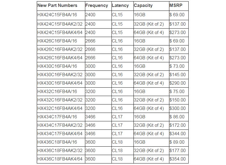A capacidade dos módulos individuais é de 16 GB. Eles também estarão disponíveis em conjuntos de dois e quatro, com capacidade total de 32 e 64 GB, respectivamente. Os horários e preços podem ser encontrados na tabela abaixo.