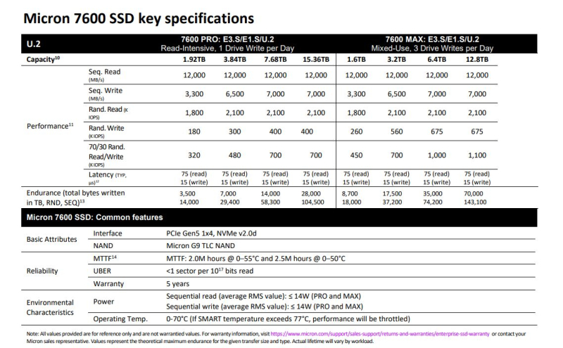 A série é representada pelos modelos Micron 7600 Pro, com desempenho de gravação diária (DWPD) de 1 e capacidades de 1,92 a 15,36 TB, e o Micron 7600 Max, com DWPD de 3 e capacidades de 1,6 a 12,8 TB. Os novos produtos são lançados em três formatos: E3.S, E1.S e U.2. De acordo com a Micron, o controlador, a memória flash NAND, a memória cache DRAM e o software são todos produzidos internamente.