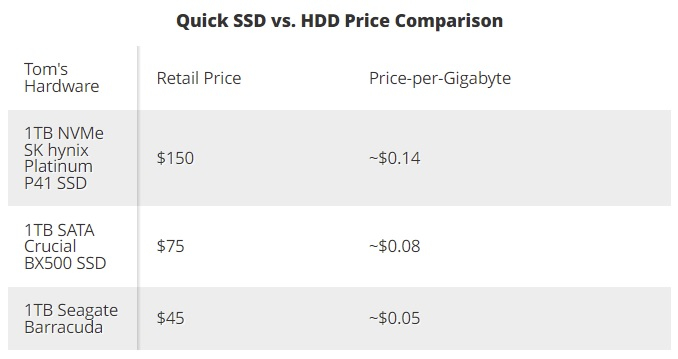 Por um lado, a transição para o SSD é bastante lógica. Ao contrário dos discos rígidos convencionais, esses discos não criam ruído e operam muito mais rápido do que os HDDs convencionais. No entanto, apesar da queda nos preços dos SSDs nos últimos anos, mesmo os modelos mais acessíveis dessas mídias agora tendem a custar mais do que os modelos de HDD com a mesma capacidade. Se compararmos SSD e HDD com capacidade de 1 TB, o custo de um gigabyte de memória como parte de um HDD custa cerca de US $ 0,05, um SSD com interface SATA III custa US $ 0,08 e no formato M.2 NVMe dirigir custa $ 0,14. Portanto, um HDD de 1 TB custa US$ 45, um SSD SATA III custa US$ 75 e um SSD M.2 NVMe custa US$ 150.