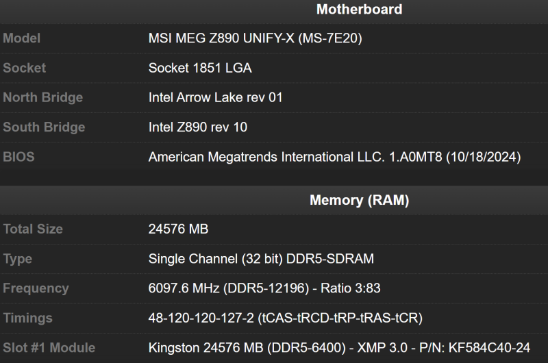 O entusiasta superou seu recorde anterior de overclock do mesmo módulo de memória em 88 MT/s. Da última vez, o módulo de RAM teve overclock para 12.108 MT/s. Segundo dados confirmados, o módulo de memória funcionou a uma frequência efetiva de 6.097,6 MHz (12.196 MT/s), com temporizações CL48-120-120-127-2.