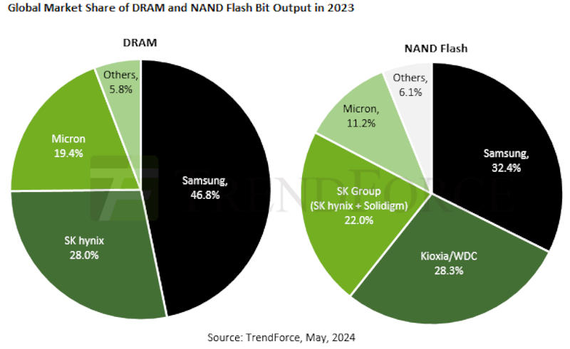 Participação da Samsung na produção global de DRAM e NAND em 2023. Fonte da imagem: trendforce.com