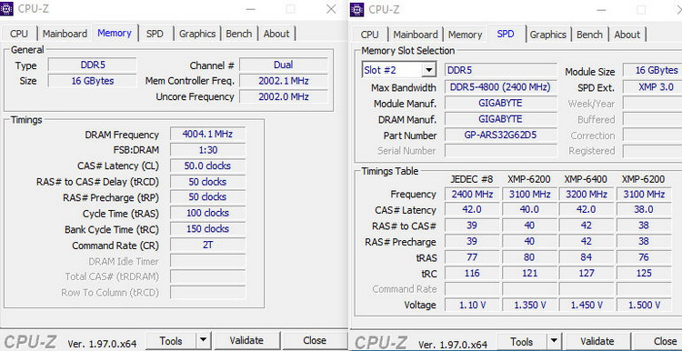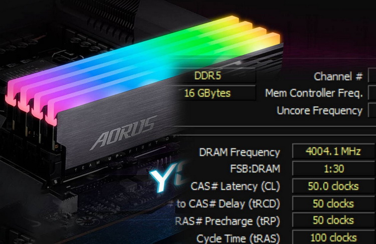 As imagens fornecidas mostram que os testes usaram memória DDR5-6200 da Gigabyte (presumivelmente da marca Aorus). Ao mesmo tempo, o entusiasta fez overclock da frequência da RAM para 4004 MHz, ou seja, até uma taxa de transferência de dados de 8008 MT / s com temporizações CL50-50-50-125-150-2T. Em outras palavras, o modo de memória efetivo era DDR5-8000. Para atingir essa velocidade, foi necessário aumentar a voltagem da memória para 1,5 V.
