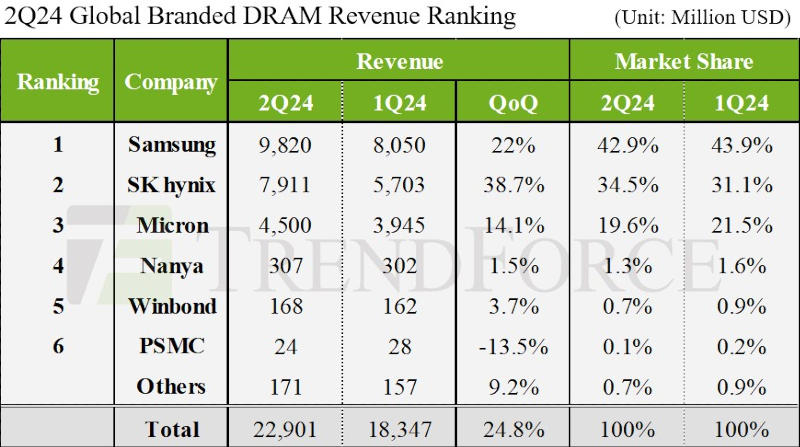 A Samsung aumentou seu preço médio de chips em 17% a 19% e aumentou seu fornecimento de bits, fazendo com que sua receita de DRAM subisse 22%, para US$ 9,82 bilhões, e mantivesse sua posição de liderança de mercado. A SK Hynix, por meio da certificação e fornecimento em massa de produtos HBM3E, aumentou seu fornecimento de bits em mais de 20%, devido ao qual sua receita aumentou 38,7%, para US$ 7,91 bilhões. A receita da Micron no segundo trimestre aumentou 14,1%, para US$ 4,5 bilhões. bilhões, apesar de uma ligeira diminuição no preço médio ponderado dos produtos, e os fornecimentos em bits aumentaram 15-16%. A empresa tem vendido agressivamente o estoque de DDR5 1-beta, mas ficou para trás de concorrentes maiores.