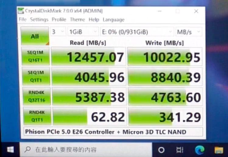 Phison mostrou armazenamento NVMe no controlador PS5026-E26, equipado com 1 TB de memória 3D TLC NAND da Micron. A velocidade máxima de leitura sequencial do SSD foi de 12.457 MB / se grava – no nível de 10.023 MB / s (dados CrystalDiskMark). Quanto ao desempenho das operações aleatórias de leitura e escrita de blocos de 4K, atingem valores de 1,31 e 1,16 milhões de IOPS, respectivamente. Esses números são significativamente maiores do que a maioria dos modelos de SSD PCIe 4.0 x4 para consumidores.