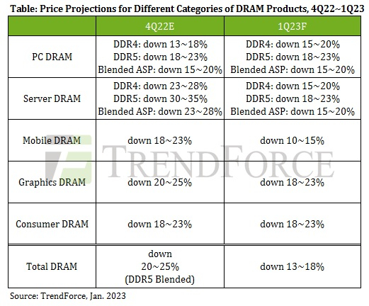Os analistas da TrendForce publicaram uma previsão para o mercado de memória DRAM no primeiro trimestre de 2023. Espera-se que todos os tipos de memória DRAM neste período caiam de preço em média 13-18%. A pressão do fornecedor continua forte, pois a baixa demanda por eletrodomésticos e eletrônicos mantém os níveis de estoque de DRAM baixos. Para evitar uma queda acentuada nos preços, muitas empresas, como a Micron, tiveram que cortar a produção.