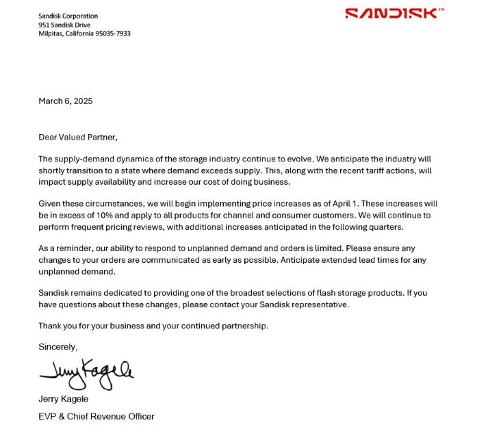 A SanDisk aumentará o preço da memória flash NAND em mais de 10% a partir de 1º de abril. O fabricante relatou isso em uma carta aos seus principais clientes. A empresa americana explica o próximo aumento de preço pela mudança na dinâmica do mercado, uma recuperação esperada na demanda por memória flash NAND e um aumento nas tarifas de exportação.