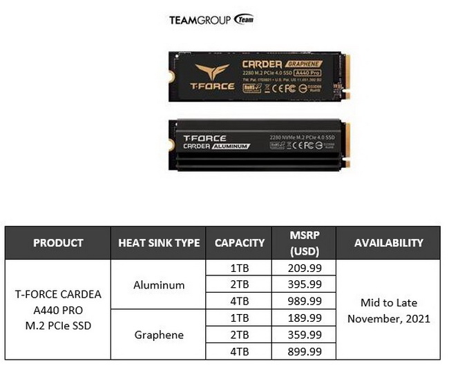 A empresa estimou os drives NVMe da série T-Force Cardea A440 Pro com um volume de 1, 2 e 4 TB, equipados com dissipador de calor de grafeno, em 190, 360 e 900 dólares, respectivamente. Versões de drives com dissipador de calor de alumínio custam US $ 210, US $ 396 e US $ 990, respectivamente. Todos os novos itens estarão à venda no final do próximo mês.