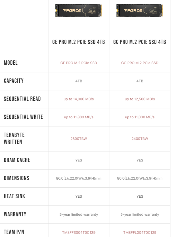 As unidades da série T-Force GC PRO estão disponíveis em modelos de 2 e 4 TB. Eles afirmam uma velocidade máxima de leitura sequencial de até 12.500 MB/s e velocidade de gravação sequencial de até 11.000 MB/s. Por sua vez, para os modelos GE PRO são reivindicadas velocidades de até 14.000 e 11.800 MB/s, respectivamente. Essas especificações são para versões SSD de 4 TB.