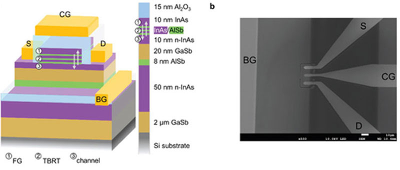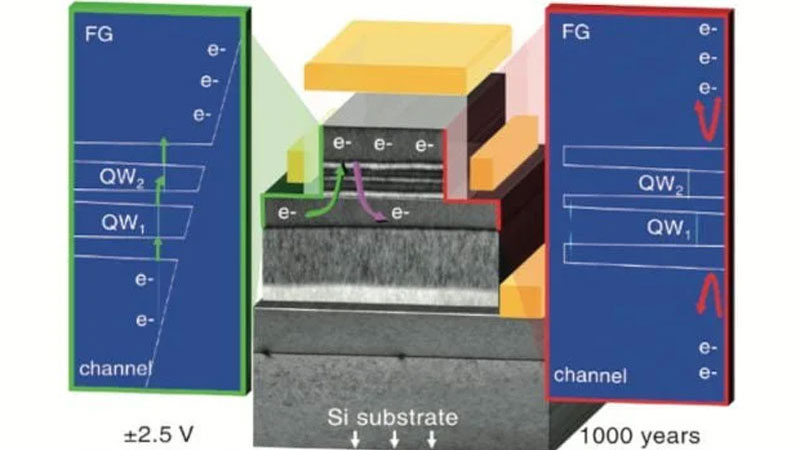 Alta estabilidade e retenção de carga ultralonga são prometidas pelo design e materiais usados ​​da ULTRARAM, e não é silício. A célula de armazenamento e a camada rica em elétrons são separadas por três barreiras de arseneto de índio e antimoneto de alumínio (InAs/AlSb). O isolamento é tão bom que o vazamento de carga pode ser desprezado. Mas como os elétrons entram em uma célula?