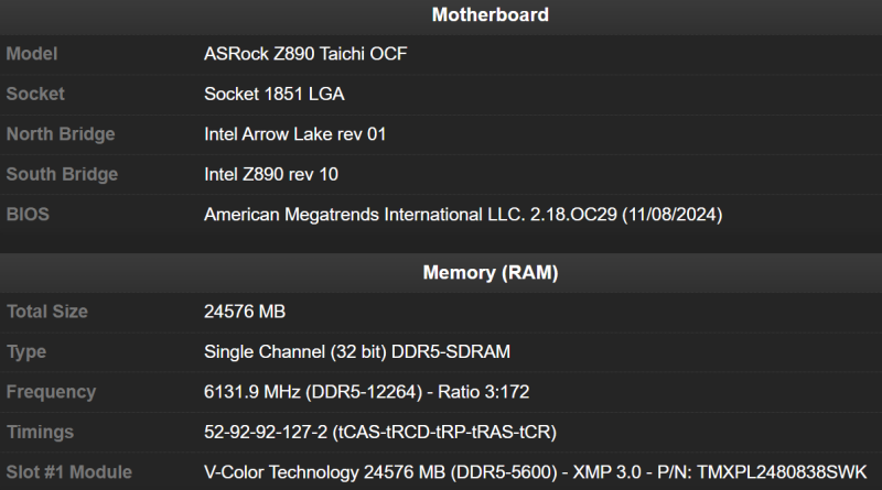 Para o experimento, usamos um módulo de RAM V-Color Manta XFinity RGB CUDIMM DDR5 de 24 GB, que foi primeiro overclockado pelo overclocker americano AKM para uma frequência efetiva de 6131,9 MHz (ou 12.264 MT/s). A memória passou a funcionar com temporizações CL 52-92-92-127.