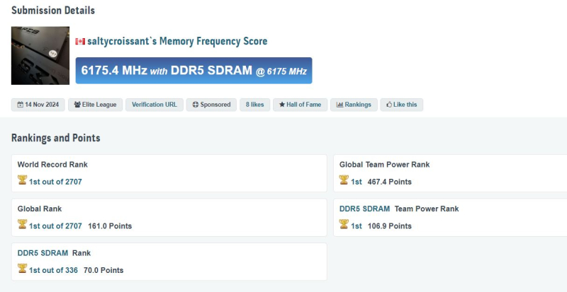 Mais tarde, o overclocker canadense saltycroissant compartilhou os resultados do overclock do mesmo módulo de memória na mesma placa-mãe. Ele fez overclock do módulo de memória para uma frequência efetiva de 6.175,4 MHz (12.350,8 MT/s). Em ambos os casos, foi utilizado nitrogênio líquido para resfriar os componentes.