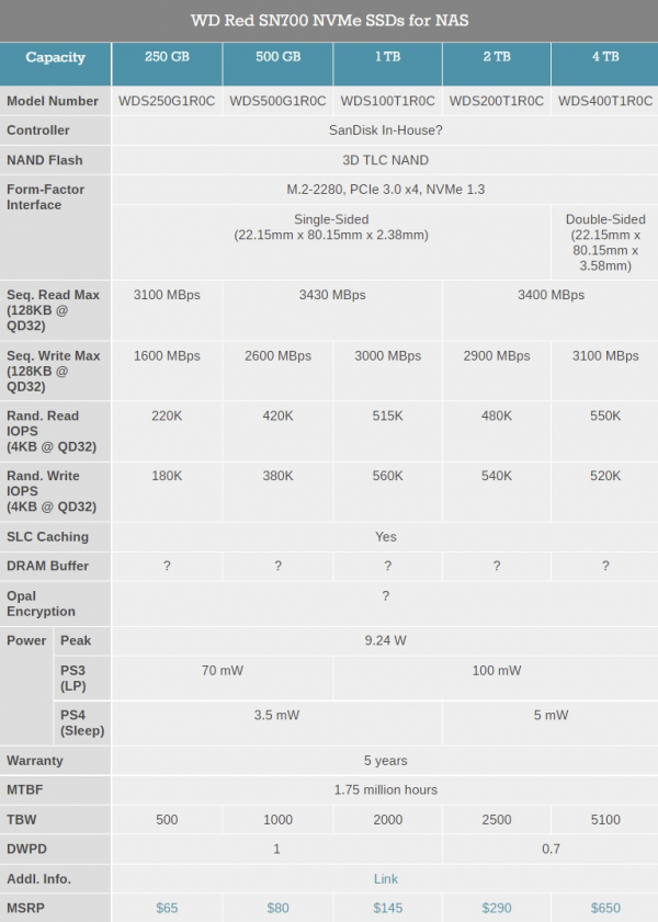 A série WD Red SN700 inclui cinco capacidades de armazenamento: 250 e 500 GB, bem como 1, 2 e 4 TB. Todos são baseados em chips de memória flash 3D NAND TLC. O fabricante não indica qual controlador é usado nos dispositivos, mas afirma que ele suporta a interface PCIe 3.0 e está em conformidade com as especificações NVMe 1.3.