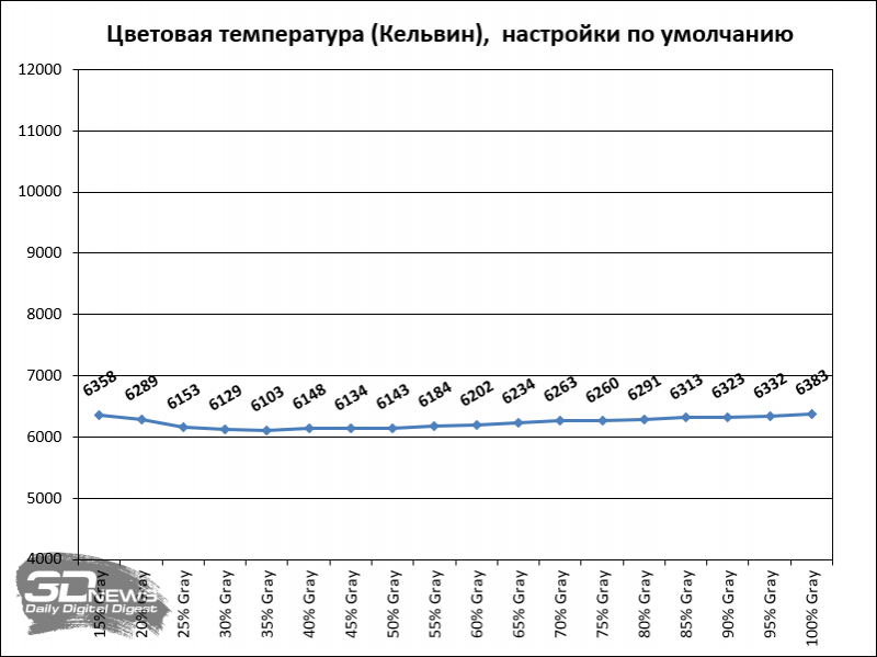 O desvio da temperatura de cor em unidades DeltaE é em média 3,09, e o máximo (no canto superior esquerdo) chega a 6,58 unidades, o que também é um pouco maior que o nível médio para um monitor desta diagonal.