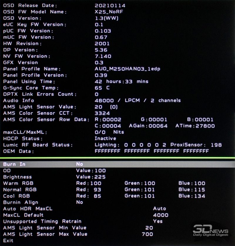 Conseguimos acessar o menu do Monitor Service. Com ele, você pode esclarecer o modelo de monitor e a matriz, a versão do firmware, configurar o ganho RGB para várias predefinições, descobrir o trabalho do painel, a temperatura do chip de sincronização G, as leituras atuais dos sensores incorporados .