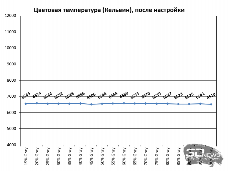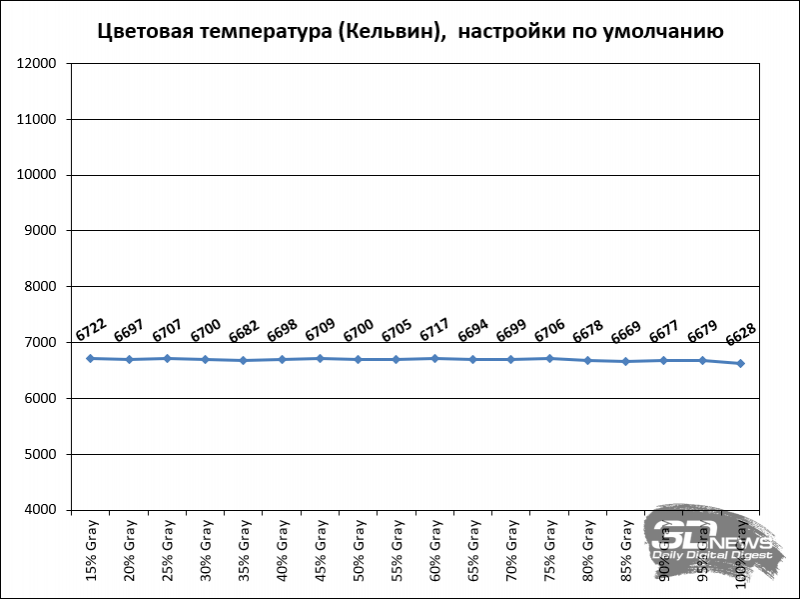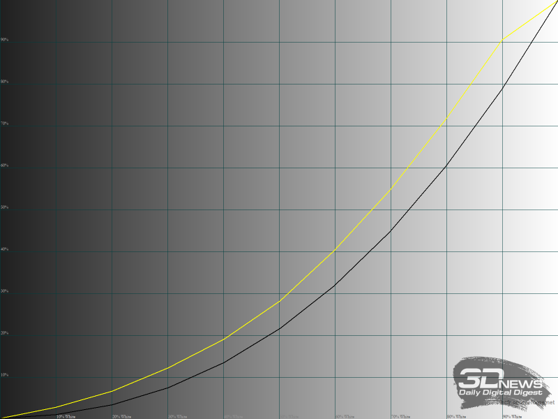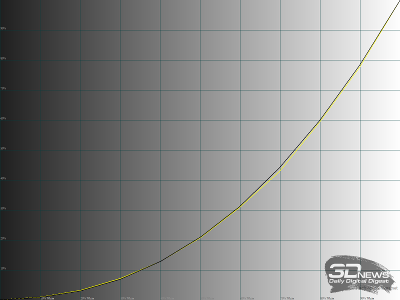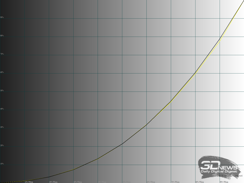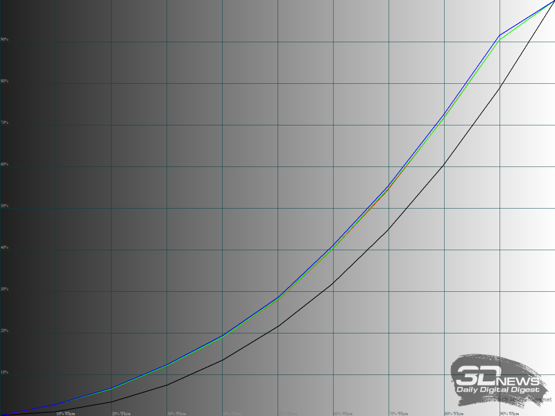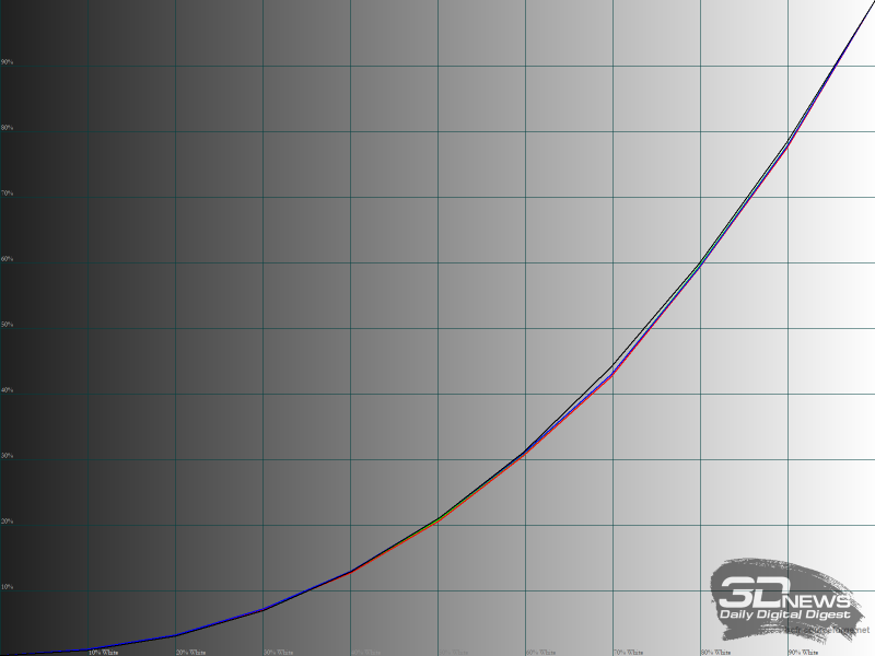 O nível médio de gama foi de 2,22, um pouco de aproximação do ideal. As discrepâncias entre as curvas de cores individuais permaneceram aproximadamente no mesmo nível baixo, quando o gamma padrão é instalado.