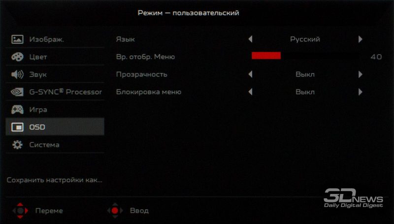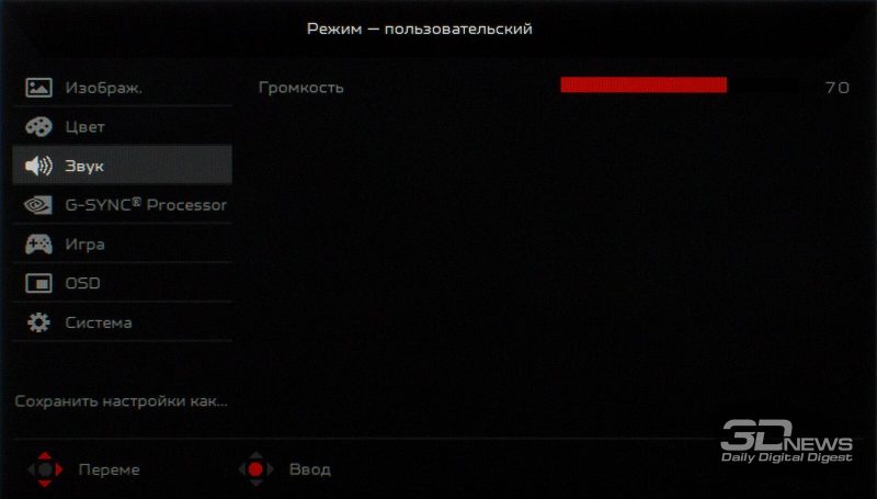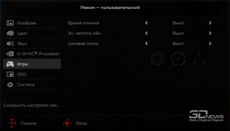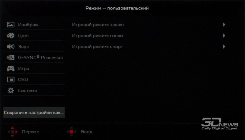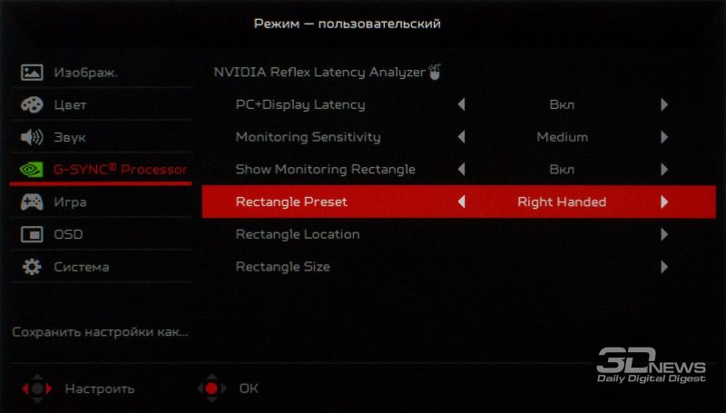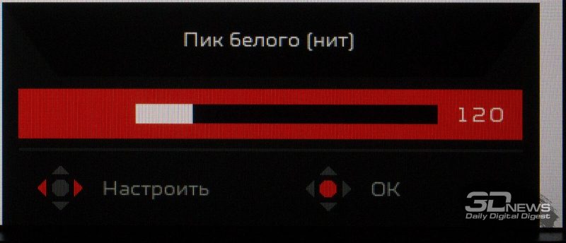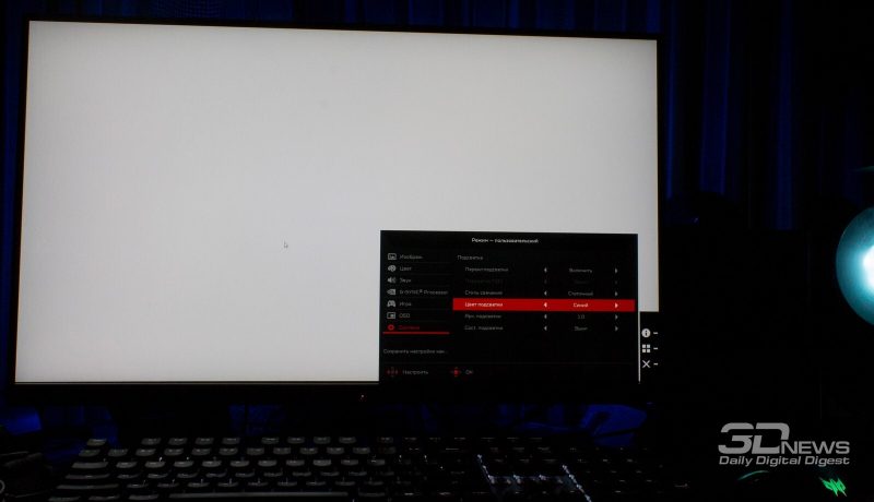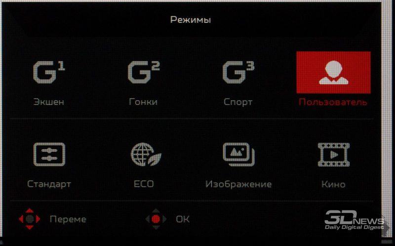 Embora este modo já tenha sido testado por nós em um monitor semelhante, decidimos ver como foi implementado no Acer (uma descrição detalhada das configurações apropriadas do manual do usuário, nós lideramos na descrição do menu) – ainda é mais interessante do que repetindo medições nas predefinições de gênero de Acer já familiarizadas para nós, que estão em conformidade com anteriormente.