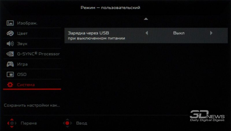 Na segunda página da seção Configurações do sistema, há apenas um item, permitindo que você ative ou desative o carregamento via USB do monitor desconectado.