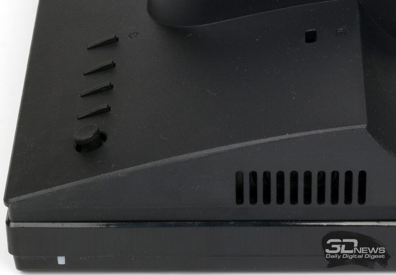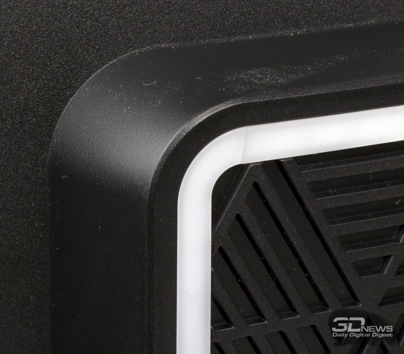 À direita há um pequeno sinal LED, ao trabalhar brilhando em azul, e no modo de espera – laranja. É impossível desativá-lo, mas graças ao tamanho pequeno e ao baixo brilho ao trabalhar não distrair.