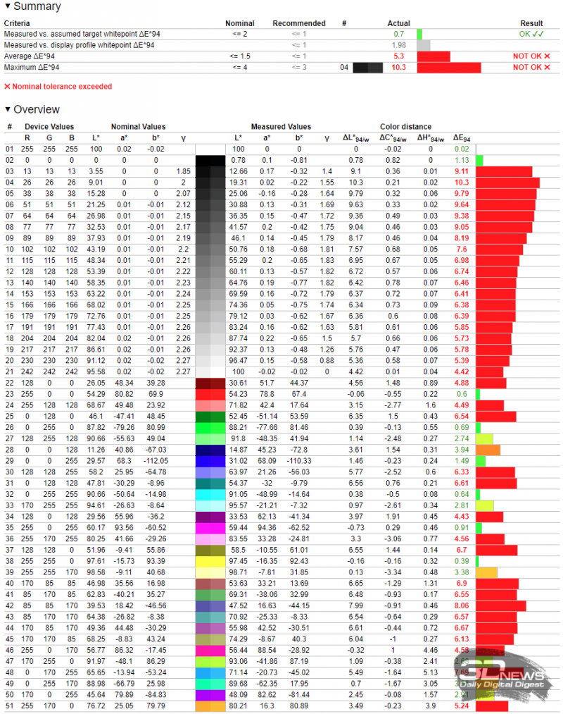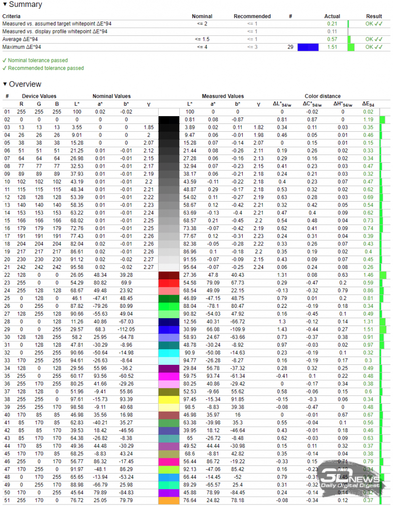O teste argyll com as configurações padrão passou com honras. O nível médio de desvios de cor foi em nossas dimensões de apenas 0,53 unidades de Deltae, que é colocada nos parâmetros já altos declarados.