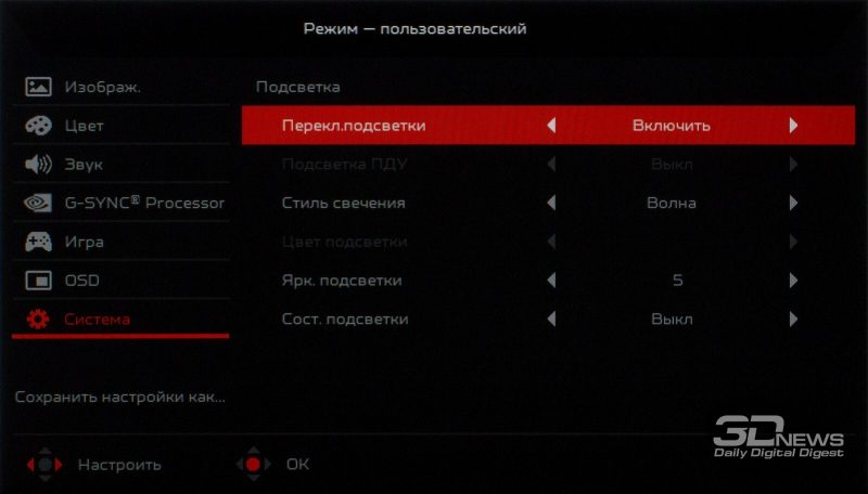 As configurações de luz de fundo permitem que você escolha uma cor (seis opções para o modo estático), brilho (em uma escala de 1 a 10) e vários efeitos de cor (nove total). O último item de configuração (iluminação de saúde, que não é muito traduzido com sucesso como “iluminação composta”) quando ativada, permite sincronizar os parâmetros de luz de fundo RGB com as predefinições de temperatura de cor para o monitor.