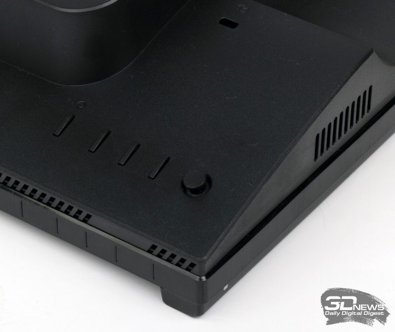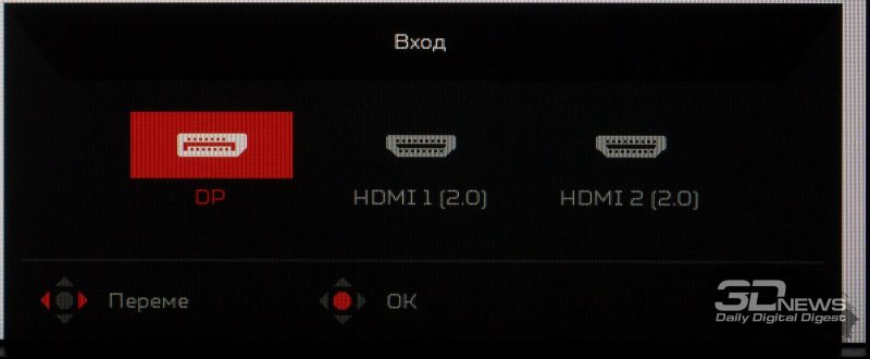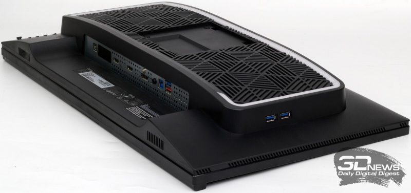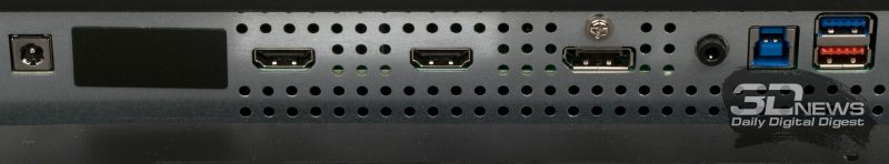 O painel de conectores inclui uma entrada de vídeo DisplayPort 1.4, duas HDMI 2.0, saída de áudio, porta USB Type-B para conectar a um PC e duas portas USB-A (uma das quais é marcada em vermelho para conectar um mouse com NVIDIA Suporte de tecnologia reflex ao escolher o item correspondente no menu).